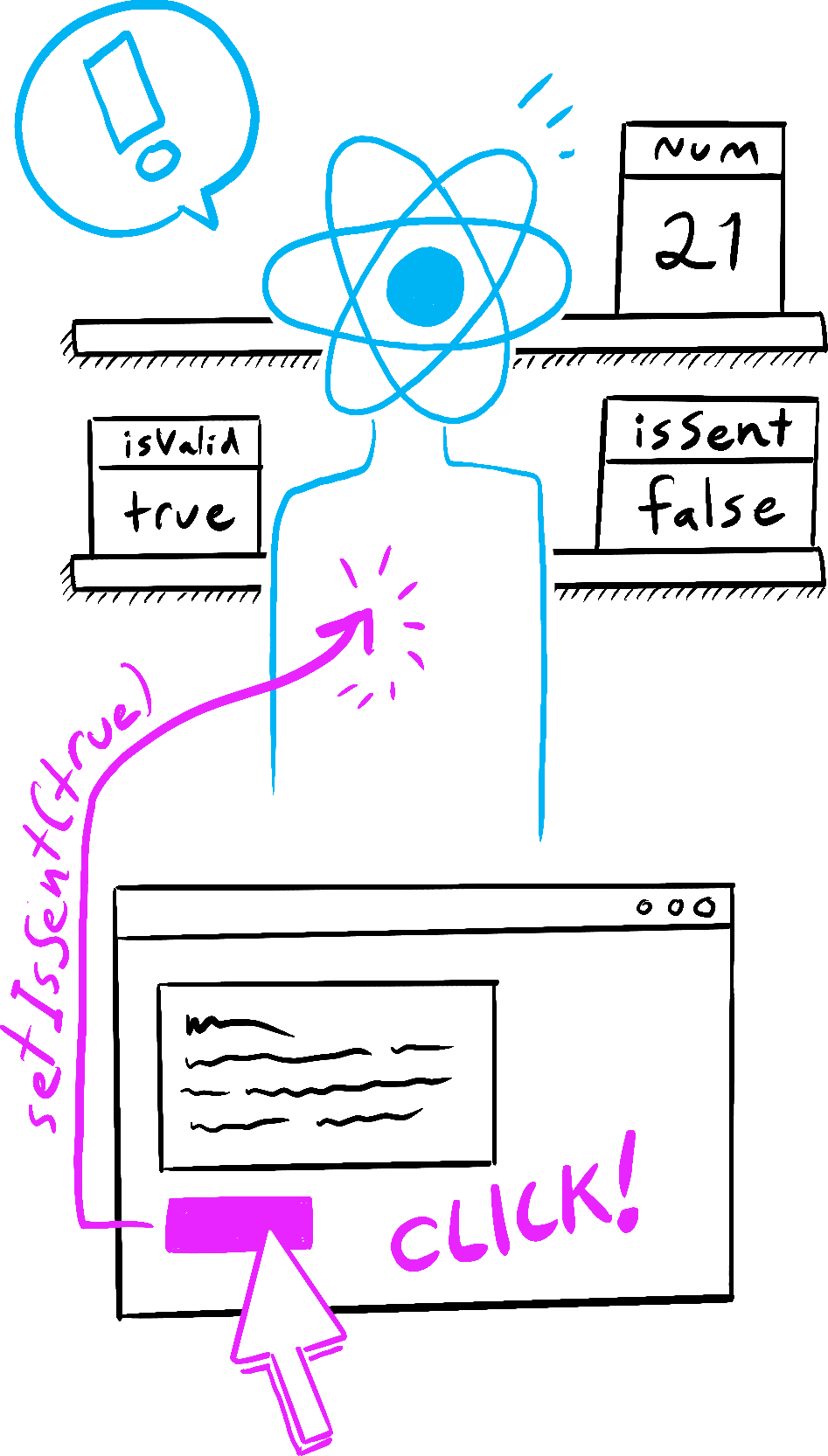 onSubmit. setIsSent(true)задаєisSentзначенняtrueі так додає до черги новий рендер.- React виконує повторний рендер компонента згідно з новим значенням